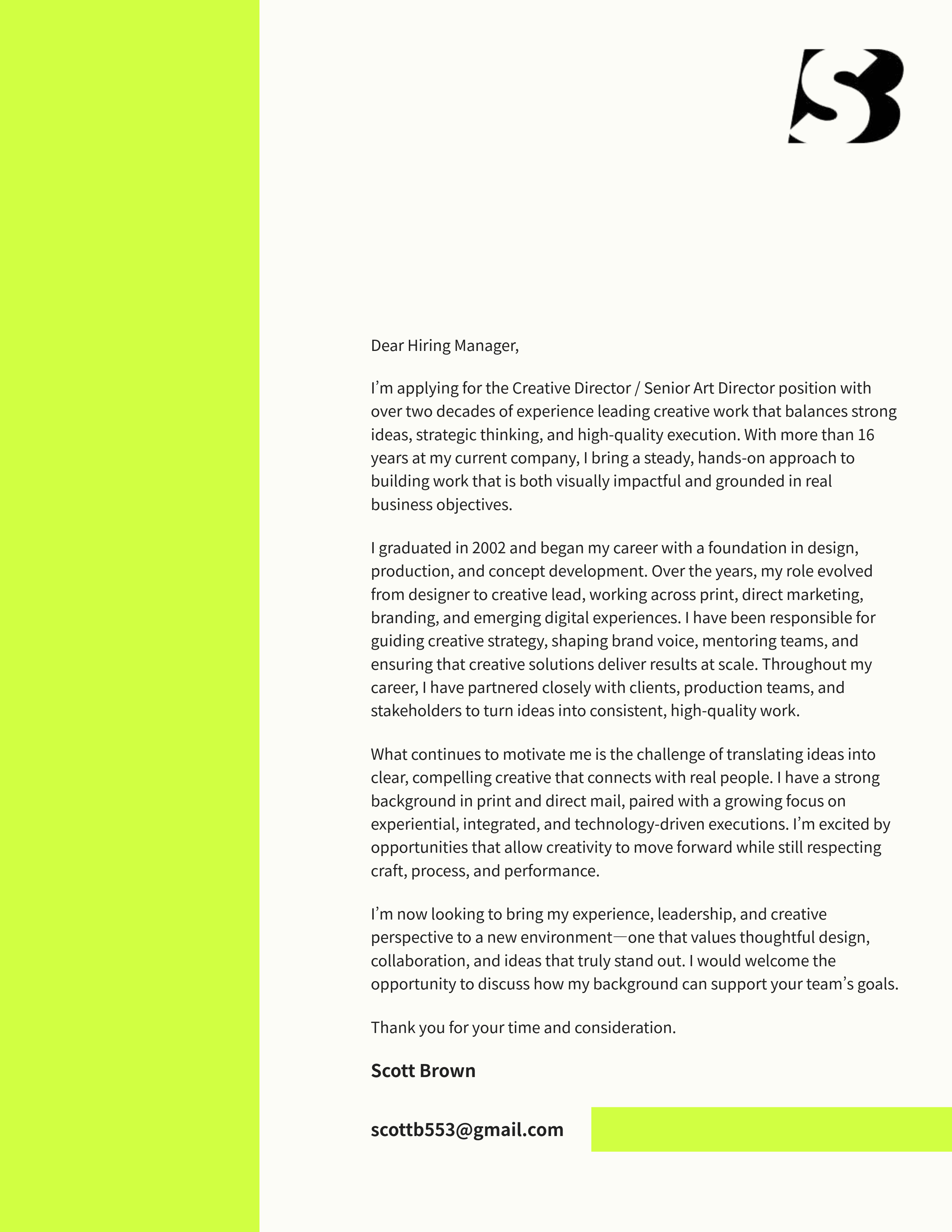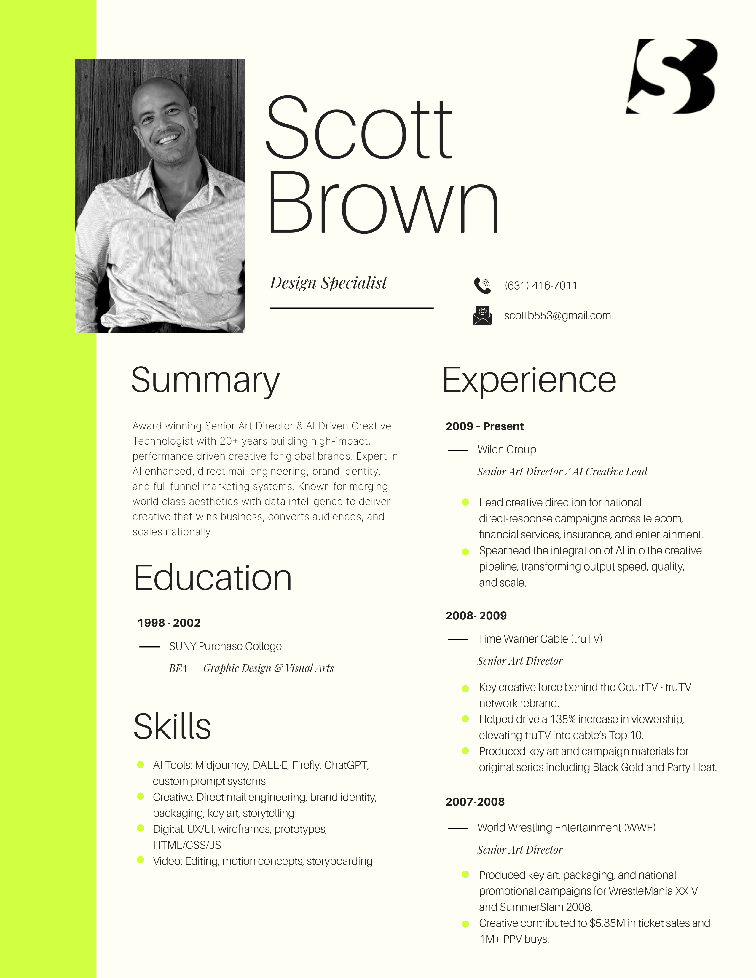 Creative Director with 20+ years of experience leading brand and campaign work for global clients. I specialize in AI-powered concept development, engineered direct mail, and scalable visual systems. I mentor creative teams, lead enterprise-level pitches, and deliver production-ready specifications that drive efficiency and reduce cost.